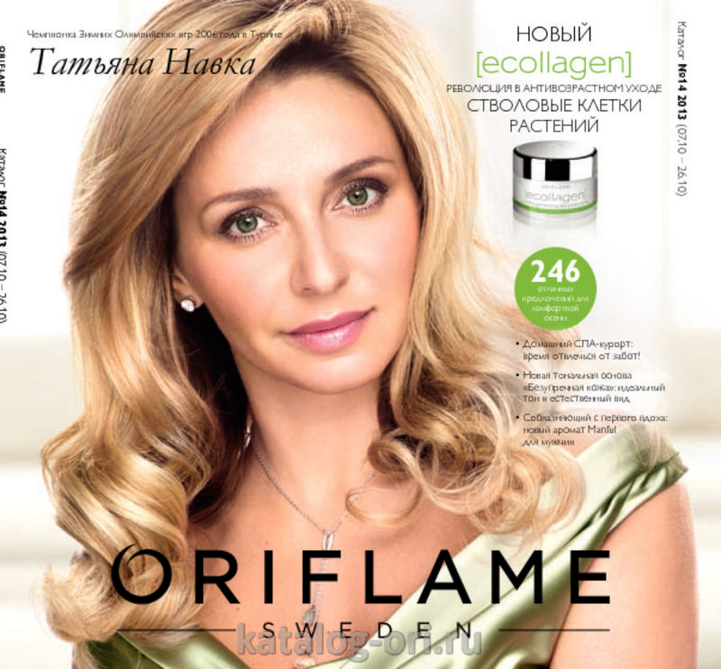 Каталог Орифлейм 14 2013 представляет новейшие разработки в области косметологии. Ученые неустанно ищут все более эффективные способы борьбы с возрастными изменениями. На этот раз в средства серии “Эколлаген” добавлены стволовые клетки растений. Их экстракт способен стимулировать выработку собственного коллагена в коже. Это настоящая революция в борьбе с морщинами - крем восстанавливает коллаген в коже и “выталкивает” морщины изнутри. Результат - более гладкая кожа, морщины становятся менее глубокими и менее заметными. Дневной крем в дополнение к этому содержит защиту от солнечного излучения spf 15. Ночной крем разглаживает кожу на 83%. Остается только добавить, что эта серии предназначена для тех, кому уже исполнилось 35 лет и представляет ее чемпионка Зимних Олимпийских Игр 2006 года Татьяна Навка.